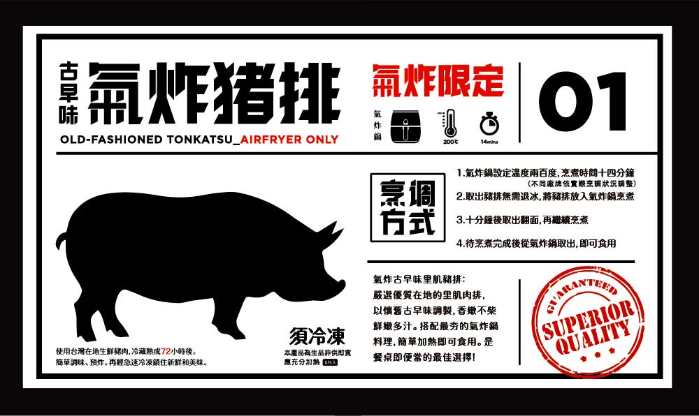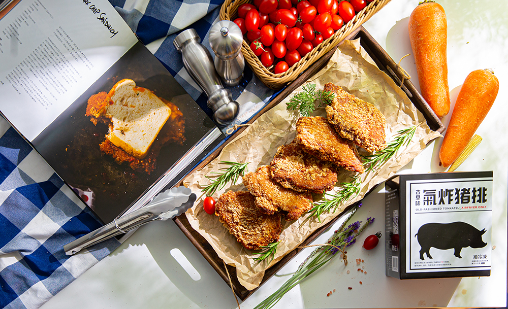 氣炸鍋:不須解凍氣炸豬排直接放入氣炸鍋,建議設定溫度200度,烹煮時間14分鐘,10分鐘後取出翻面,再繼續烹煮,完成後從氣炸鍋取出,即可食用。