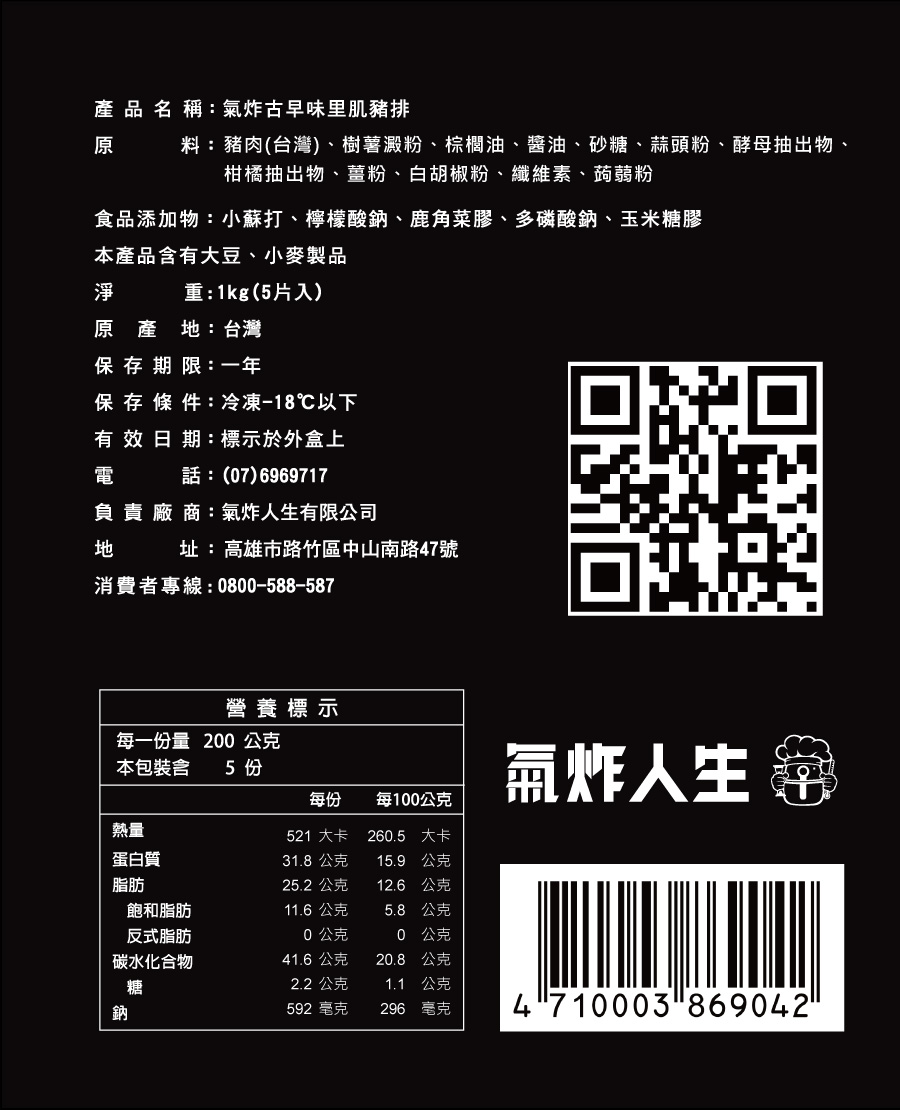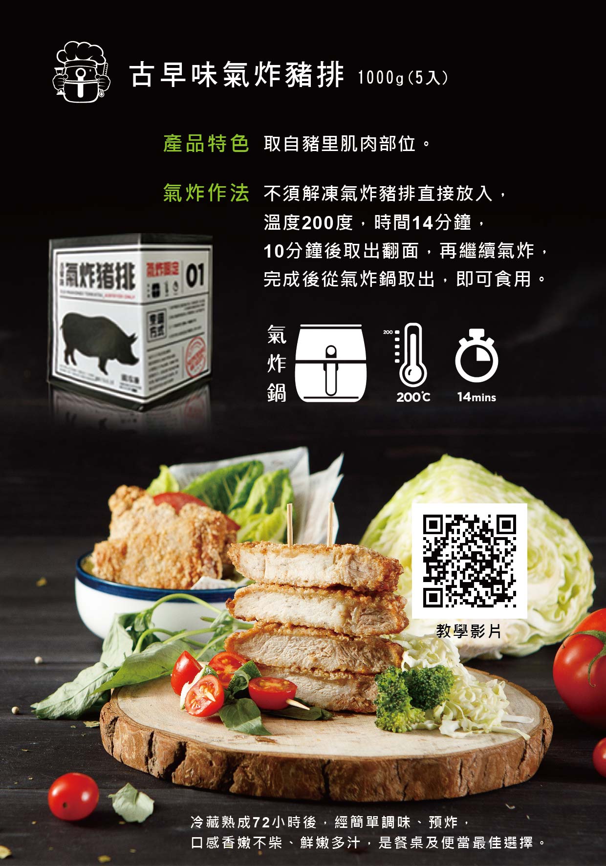 取自豬里肌肉部位。使用台灣在地生鮮里肌肉排,冷藏熟成72小時後,經簡單調味、預炸,口感香嫩不柴、鮮嫩多汁,是餐桌及便當最佳選擇。