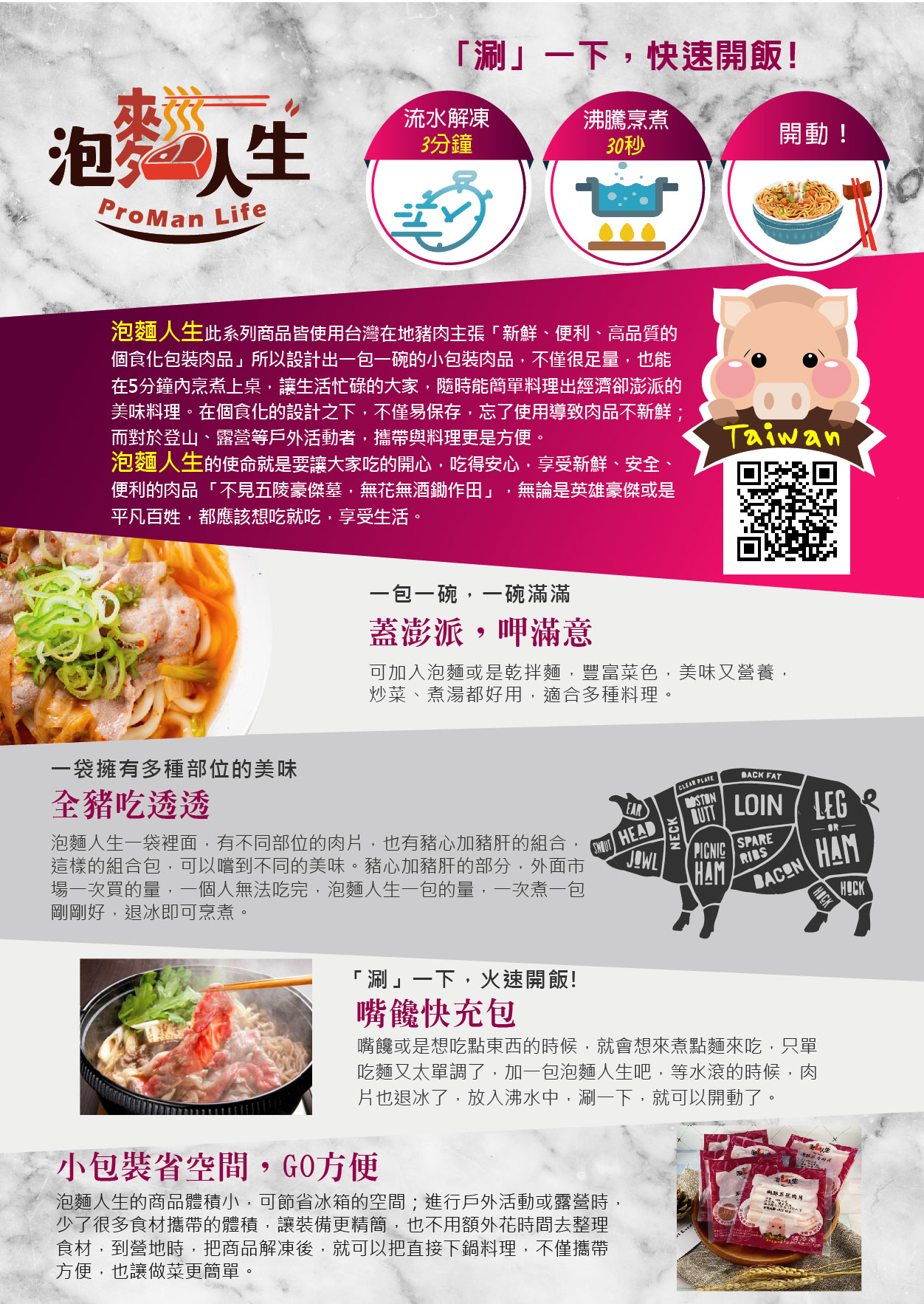 品名泡麵人生-涮豚五花肉片100g淨重100g/包內容物豬五花肉保存期限一年保存日期依包裝上日期標示保存條件冷凍-18℃以下產地台灣